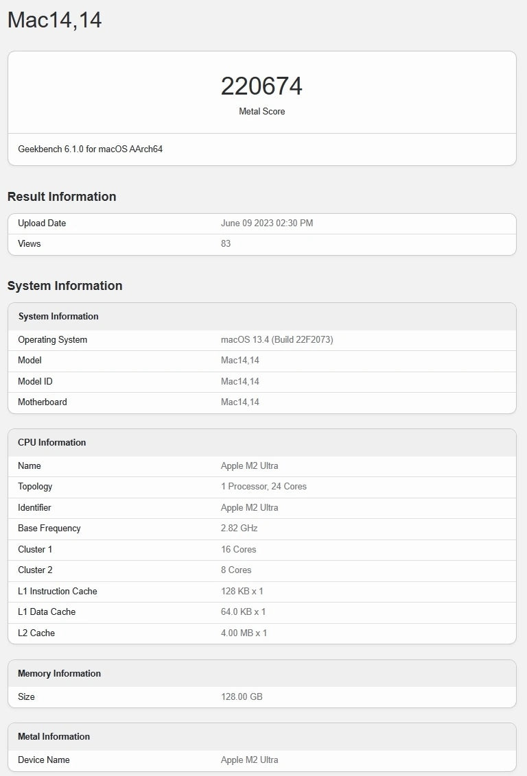 The M2 Ultra in the test has a unified RAM of 128GB and a 24 core CPU configuration, with 76 GPU cores. In the Metal test of Geekbench 6, the M2 Ultra chip scored 220674, while the M1 Ultra chip (64 graphics cores) scored 150407. This indicates that the M2 Ultra chip has significantly improved graphics processing, an increase of 46% compared to the M1 Ultra.