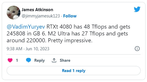 Apple's M2 Ultra chip Geekbench 6 Metal has been released, only 10% slower than the RTX 4080